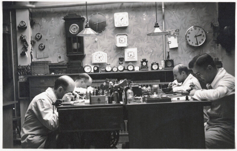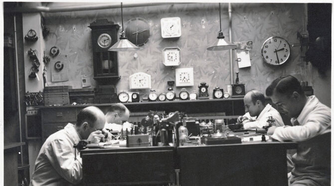 Ein Blick in die Uhrmacher-Meisterwerkstatt von Juwelier Depperich Mitte der Dreißigerjahre.