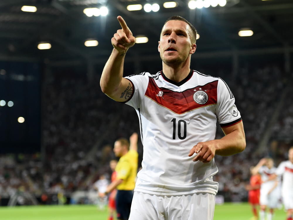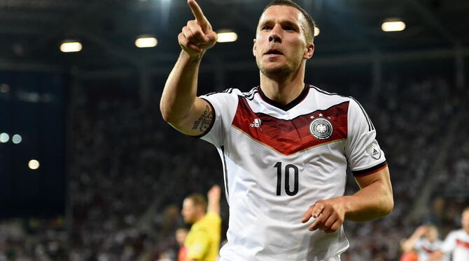 Deutschlands Lukas Podolski jubelt über seinen Treffer zum 2:1. Foto: Thomas Eisenhuth/dpa