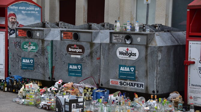 TÜBINGEN. Gerade einmal knapp vier Wochen ist es her, dass sich Tübinger Bürger im Netz über völlig überfüllte Altglascontainer in der Tübinger Innenstadt beschwerten. Mit Fotos wiesen sie auf die Berge an leeren Flaschen und Konservengläsern hin, die sich um die Behältnisse herum stapelten. Das Landratsamt Tübingen verwies den GEA damals an das zuständige Entsorgungsunternehmen Alba Group. Das erklärte die überfüllten Container mit einem höheren Glasmüll-Aufkommen in Privathaushalten während der Coronapandemie und dem Ausfall eines Abfuhrfahrzeugs. Alba Group versprach schnelle Abhilfe. Die betreffenden Container sind inzwischen geleert worden. An anderen Orten im Kreis sieht es dafür wieder aus, als habe die Dorfgemeinschaft eine riesige Party gefeiert und dann ihr Altglas entsorgt.