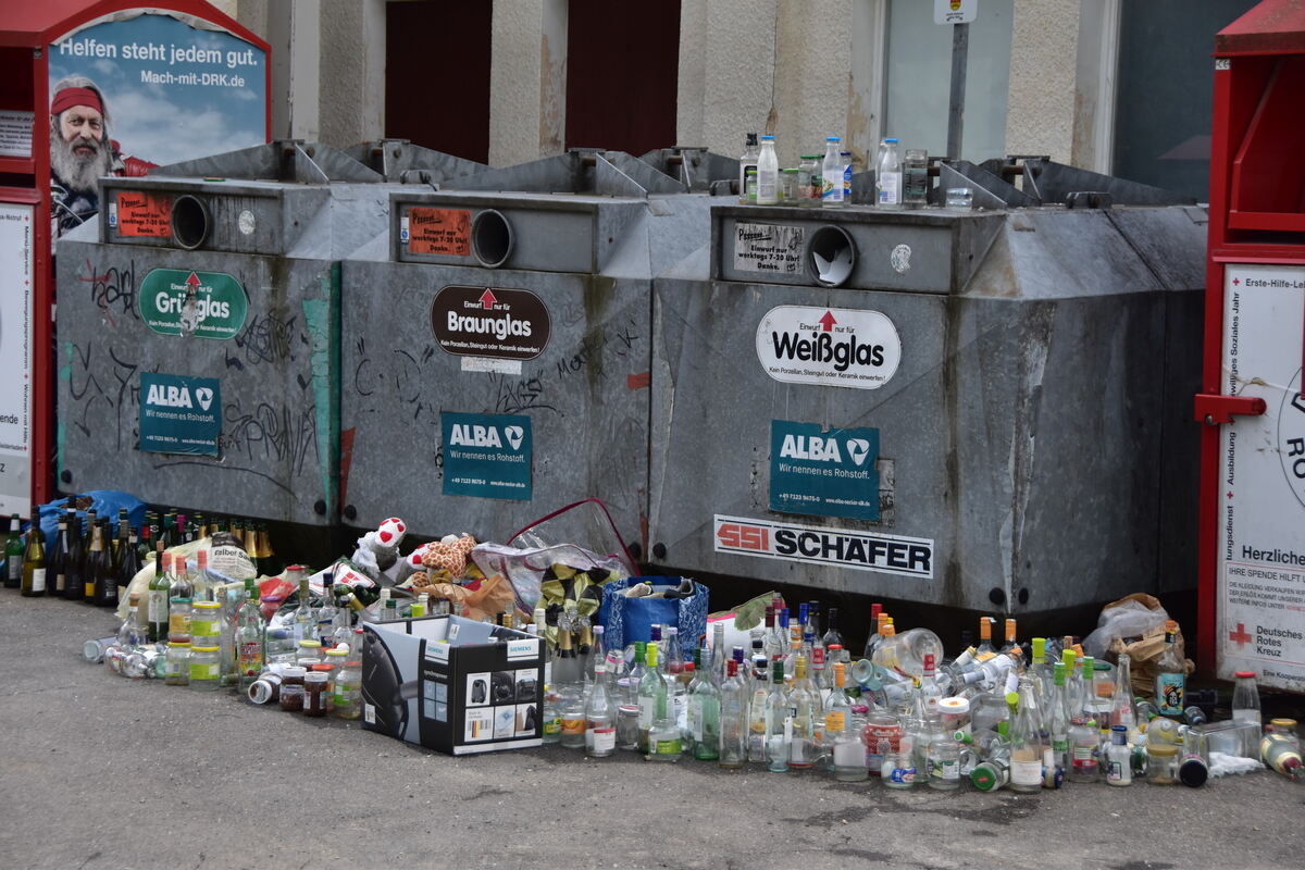 In Mössingen-Belsen etwa steht ein solcher Container, der als Container aktuell keine Funktion mehr hat. Nichts passt mehr rein. Auf dem durchnässten Boden reihen sich Weinflaschen, leere Nutella-Gläser und Gurkengläser aneinander. In eingen Gläsern sind noch Reste, die im Regen aufweichen. Ähnlich die Situation in Bodelshausen: Der Weißglas-Behälter hat keine Kapazität mehr.