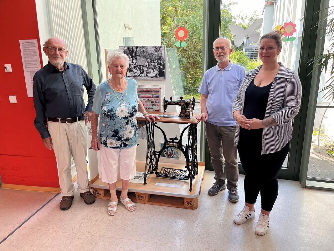 Die neue Ausstellung im Wannweiler Seniorenzentrum auf einem Podest von einem Quadratmeter ist dem Thema »Die Geschichte des Nähens« gewidmet. Im Bild die Organisatoren Hauke Petersen (links) und Walter Ott (Zweiter von rechts) von der Geschichtswerkstatt mit Einrichtungsleiterin Ann-Cathrin Steck (rechts).