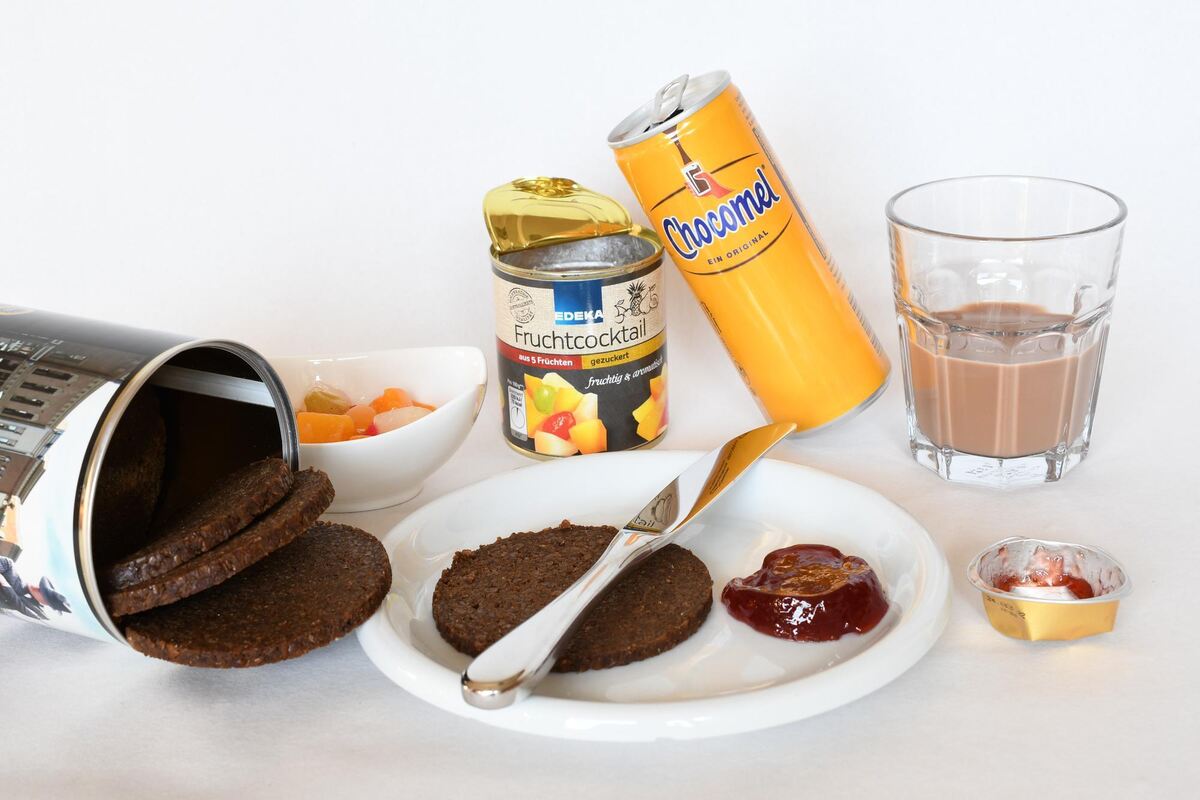 Ein ganz haltbares Frühstück: Büchsenbrot und Blech-Kakao.