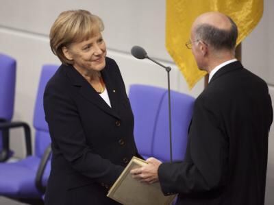 BERLIN. Sie ist wieder Kanzlerin. Um 10.58 Uhr erfährt Angela Merkel, dass sie eine sichere Mehrheit bekommen hat. Doch glanzvoll ist der Start nicht. Mindestens neun Stimmen aus dem schwarz-gelben Koalitionslager fehlen der CDU-Chefin. Das Resultat passt zu den holprigen Koalitionsverhandlungen von Union und FDP. Es kündigt sich für Merkel eine schwierige Wahlperiode an. Diesmal wird ihr das Ergebnis nicht per SMS wie vor vier Jahren übermittelt.