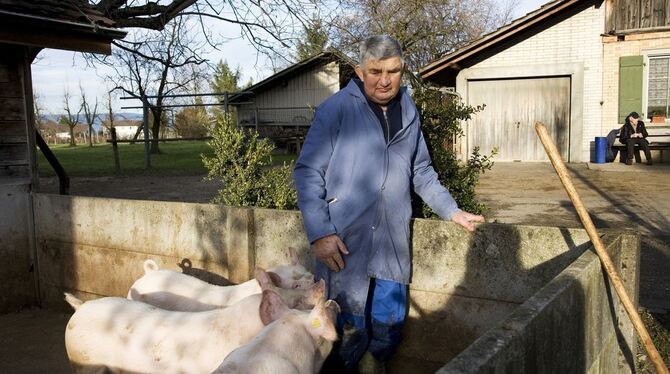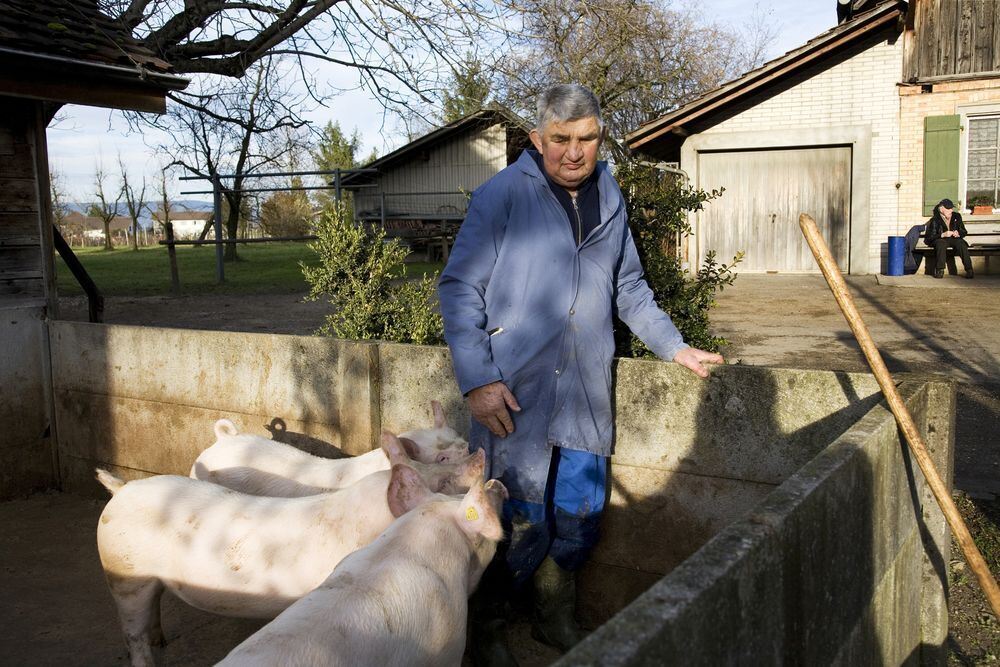 Immer noch eine Aufgabe: Walter Zingg ist für die Schweine zuständig auf dem Bauernhof des Dienstbotenheim. Foto: Katharina Alt
