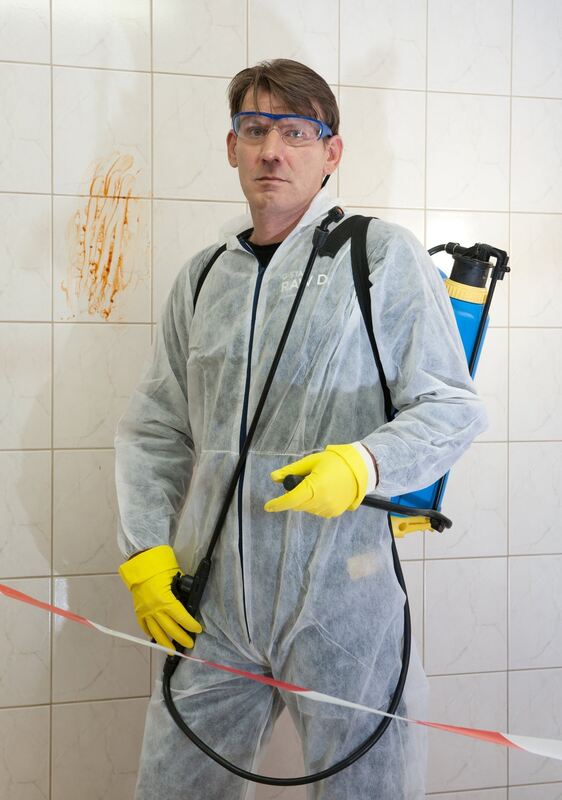 Der Tatortreiniger Christian Heistermann in seiner Arbeitskleidung. Foto: dpa