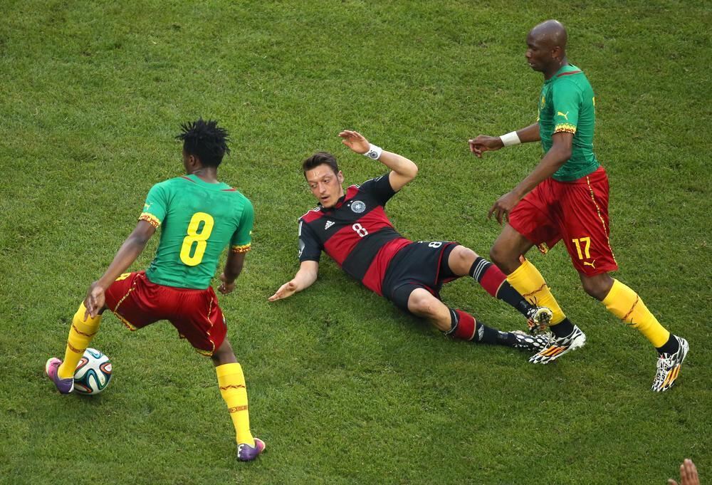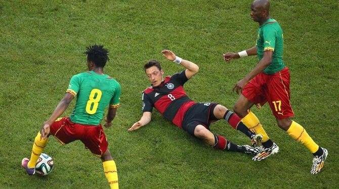 Mesut Özil (Mitte) am Boden. Der Nationalspieler vom FC Arsenal blieb weit hinter den Erwartungen zurück. FOTO: DPA