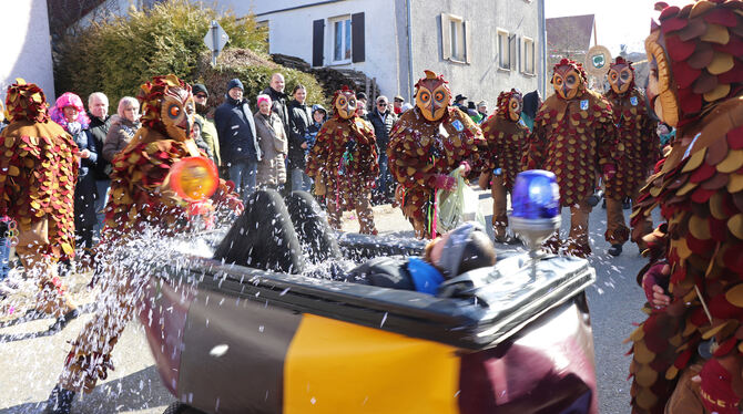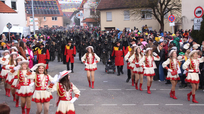 »Rälle hui!« heißt der Zwiefalter Schlachtruf. Im Mittelpunkt standen am Sonntag aber nicht die berühmten Kater, sondern eine andere Fasnets-Figur: Die »Krättenweiber« feiern ihren 50. Geburtstag, ihnen zu Ehren zogen rund 30 Gruppen durch die Münster-Gemeinde. Frack, Zylinder und Stumpen sind ihre Markenzeichen – vor allem aber natürlich, der »Krätten«, der Korb samt davorgesetzter Frauenpuppe, die sie stolz am Bauch vor sich hertragen.