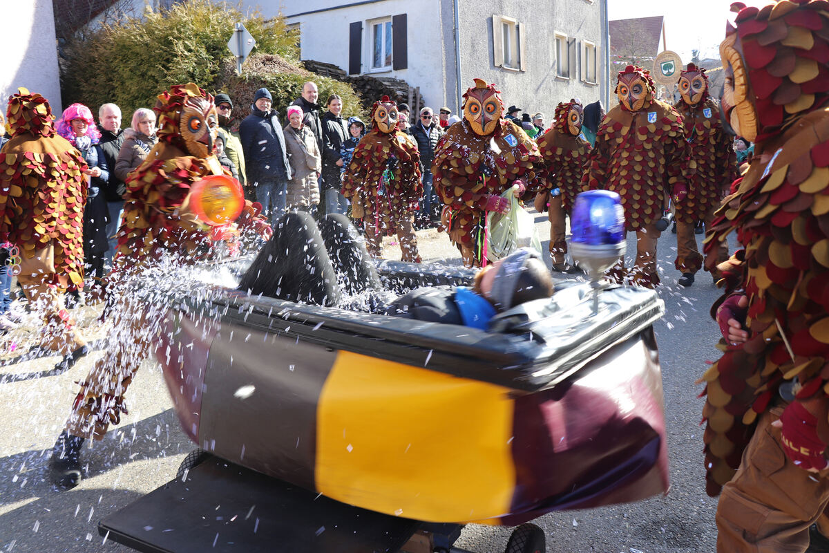 Rund 5.000 Besucher säumten im Hohensteiner Ortsteil Eglingen die Straßen, um mittendrin im turbulenten Umzugsgeschehen zu sein. Beste Stimmung herrschte dank der rund 2.500 Umzugsteilnehmer, besonders aber wegen der sehenswerten Mottowagen und Laufgruppen, mit denen sich die Eglinger Narren seit Jahrzehnten einen Namen machen. Ein Fluxkompensator fuhr reaktiv in die Zukunft, »Germany first« wurde gefordert und der Kollaps im Gesundheitssystem kritisiert. Es gab ein Umwandlungsbüro samt Genderrad, eine Unterwasserwelt sowie eine Arche Trump samt Space X, um Donald Trump und Elon Musk zum Mars zu befördern. (lpt/ma/in)