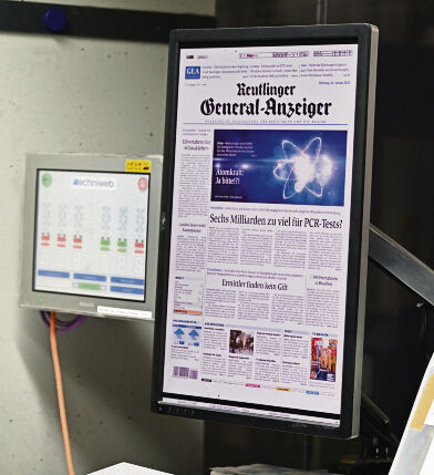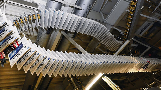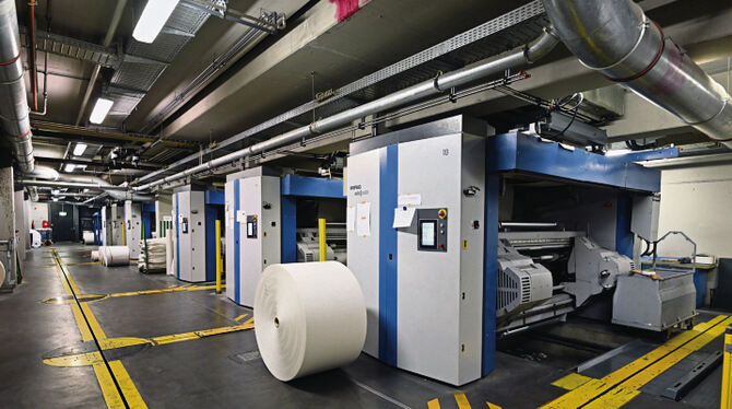 Reutlingen.Wenn Ulrike Köhler um Mitternacht im Druckzentrum Neckar-Alb erscheint, ist die GEA-Produktion voll im Gange. Dann kann die Geschäftsführerin im Leitstand mitverfolgen, wie die Drucker an den Reglern die Farben optimieren, während Tausende von Zeitungsseiten durch die Druckmaschine Wifag rasen. Diese Zeitungsrotation ist das Herzstück des Druckzentrums. 14 Meter ragen die Drucktürme in die Höhe. Aktuell lagern rund 300 Tonnen Papier auf mannshohen Rollen unter der Halle. Für eine Ausgabe des Reutlinger General-Anzeigers werden zwei bis drei Rollen benötigt, im Jahr sind es rund 1.200 Tonnen.