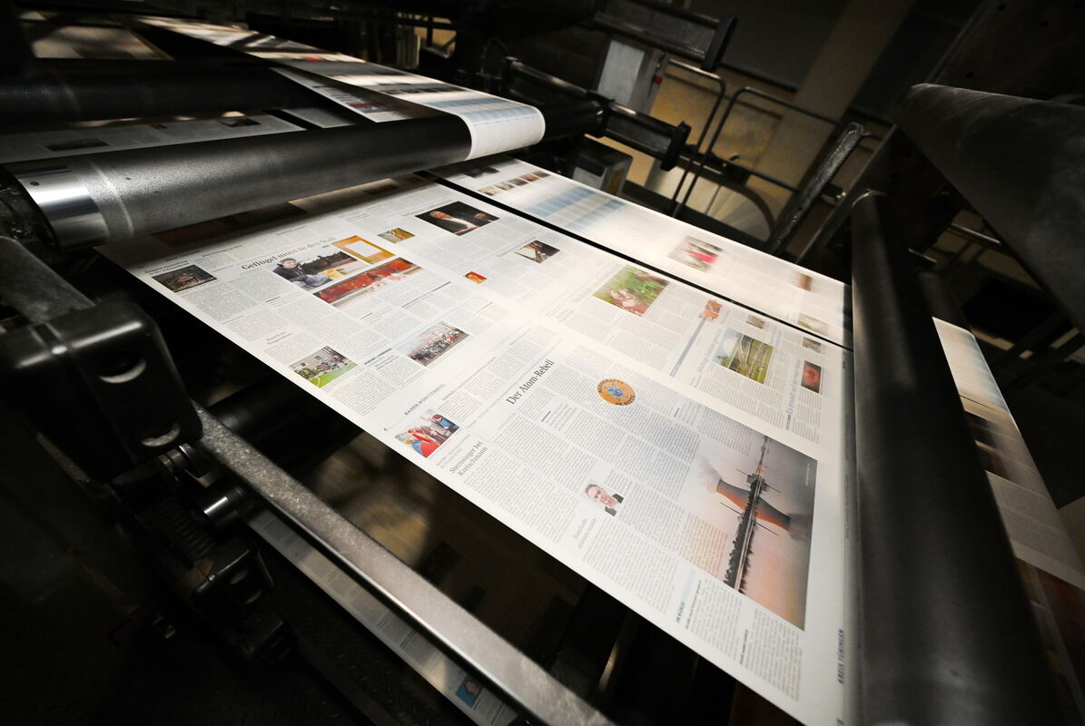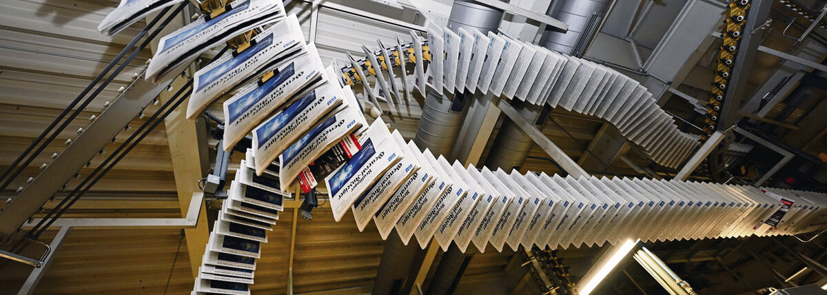Und los geht’s, der Drucker im Maschinenleitstand drückt auf den Knopf und das Monster springt an. Das Zeitungspapier wird von der Rolle in rasantem Tempo durch die Druckmaschine gezogen und jede Seite nach und nach mit den Farben bedruckt. Dabei rast das Papier durch die Wifag hoch in die Drucktürme und zurück. Automatisch wird die Papierbahn in Bögen geschnitten, jeder ist beidseitig mit vier GEA-Seiten bedruckt. Die Bögen werden in Windeseile zur Zeitung gefaltet, rasen über ein Transportsystem an der Decke entlang und werden mit Prospekten bestückt – bevor sie als Zeitungspaket den Versand verlassen.