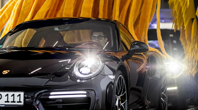 Schon vorbei? Schade! Auto waschen kann so schön sein: Man sitzt entspannt und gleitet auf Schienen dahin. Brrz – die Helferin gibt den Felgen eine Intensivdusche, dann ergießt sich leuchtendroter Schaum auf die Scheibe. Rotierende Bürsten wirbeln um das Auto, frischer Duft erfüllt das Wageninnere. Dann ein Föhn, helle Bürsten und zum Abschluss der Tanz der Trockentücher. Gerade einmal fünf Minuten dauert der Spaß. Dann schaltet die Ampel auf Grün und eine LED-Anzeige wünscht »Gute Fahrt!« Doch erst geht es noch zum Feinschliff an einem der überdachten Staubsaugerplätze.