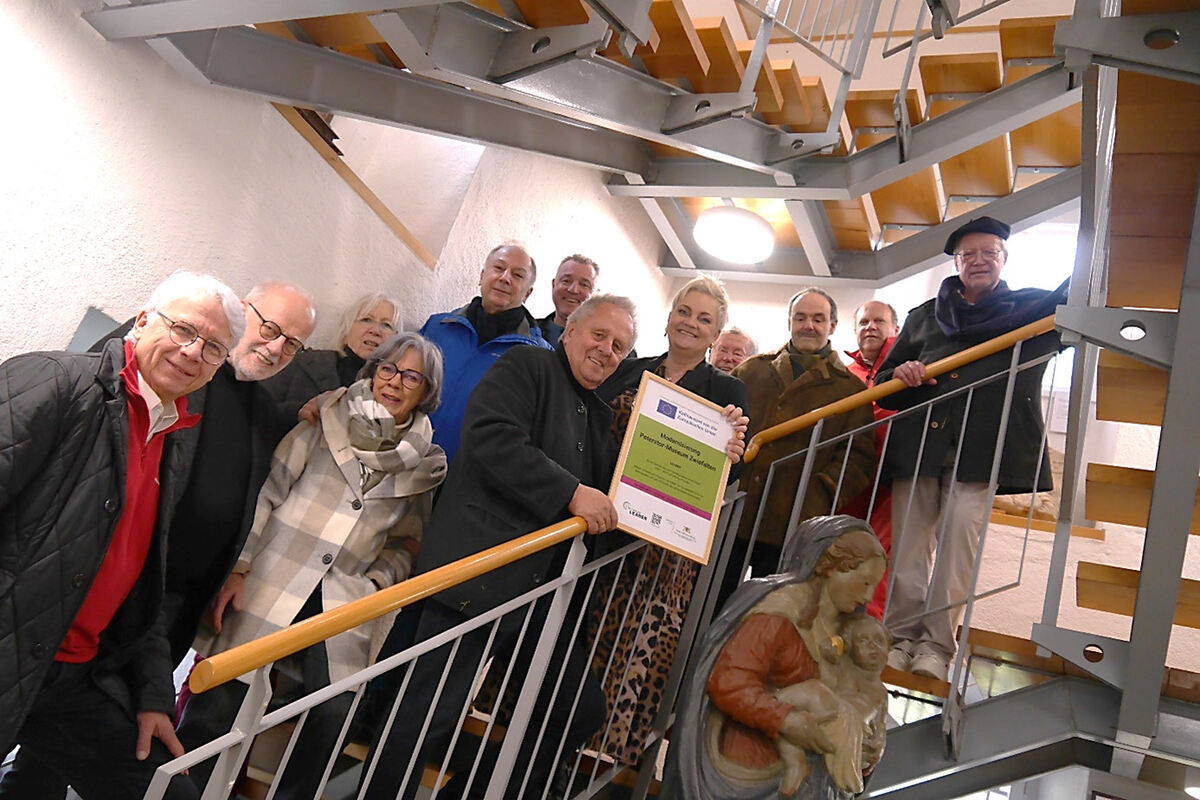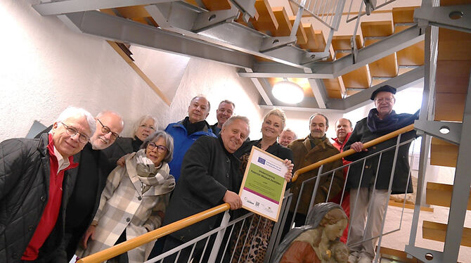Der Projektverantwortliche Hubertus-Jörg Riedlinger (Mitte) und Bürgermeisterin Alexan-dra Hepp präsentieren die Leader-Plakette. Umringt werden sie von Vereinsmitgliedern und Projektunterstützern. FOTO: LEADER
