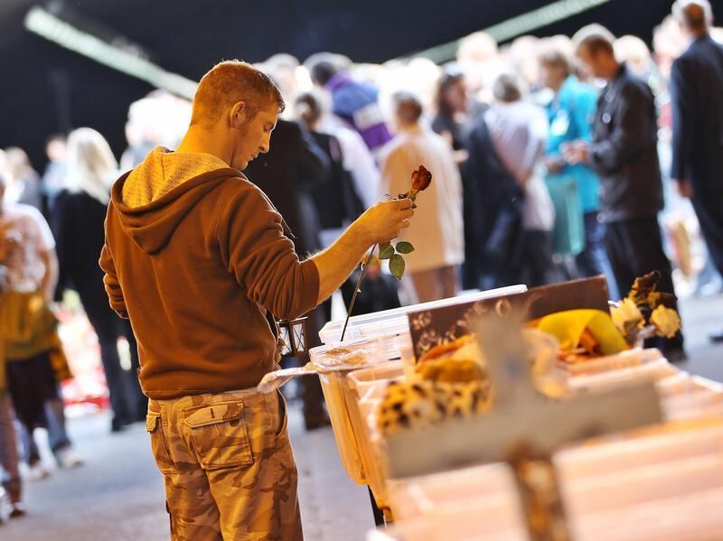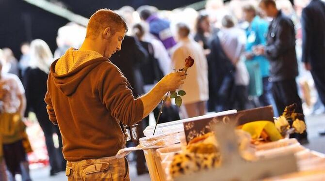 Helfer und Angehörige tragen in Duisburg Gegenstände des Gedenkens zusammen.