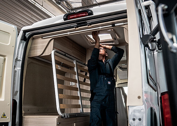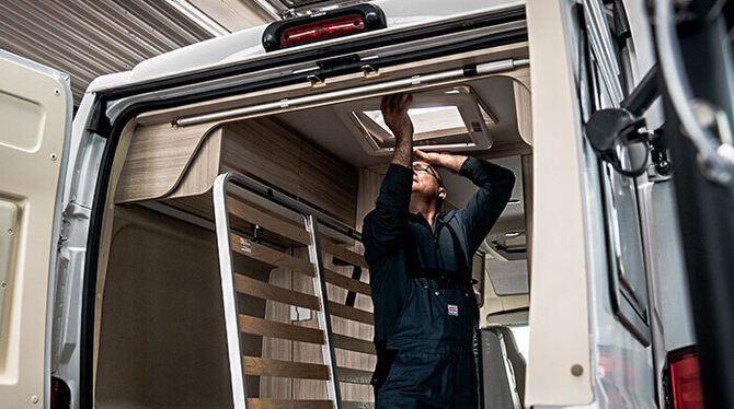 Das liegt an der Erfahrung und an der langen Betriebszugehörigkeit der Mitarbeiter. Bei einem Rundgang in den Werkstätten zeigt sich, dass der Bereich für Wohnmobile und Kleinlaster anders ist, als der für Pkw. Mehr Platz, höhere Räume und größere Hebebühnen, da steht sogar eine Kreissäge, wie in einer Schreinerei. »Wenn wir zum Beispiel einen neuen Kühlschrank einbauen, müssen wir manchmal die Arbeitsplatte in der Küche anpassen«, erläutert Sebastian Maier. Seine Mitarbeiter sind alles Fachleute: Kraftfahrzeugmeister, -elektriker und -mechatroniker. Ein Teammitglied ist »Reifen- Hotel-Managerin«. In dem »Reifen-Hotel« lagert der Fachbetrieb rund 800 Radsätze für die Kunden ein und kümmert sich darum, dass der Reifenwechsel den Jahreszeiten entsprechend reibungslos abläuft. So können die Kunden nicht nur entspannt in den Tag, sondern auch entspannt in den Sommer starten.