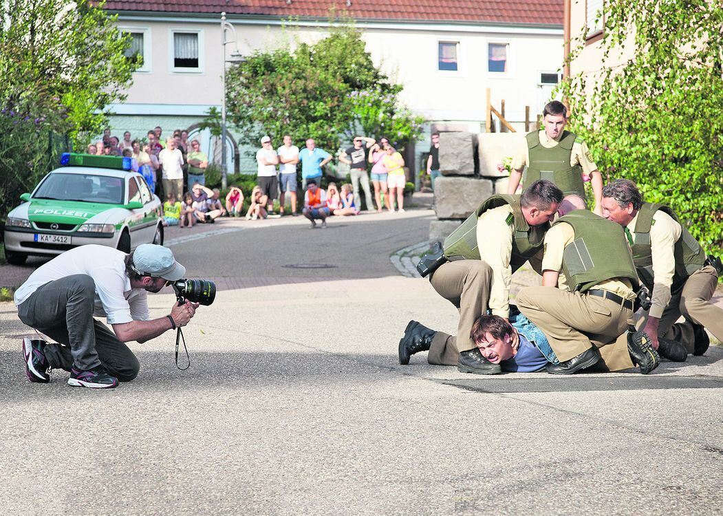 Bei den Dreharbeiten: Harry Wörz (Rüdiger Klink) wird auf offener Straße festgenommen. FOTO: SWR/TEAM WORX/GRISCHA SCHMITZ