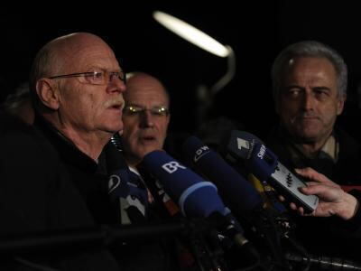 Der SPD-Fraktionsvorsitzende Struck, der Unions-Fraktionsvorsitzende Kauder und CSU-Landesgruppenchef Ramsauer vor dem Kanzleramt.