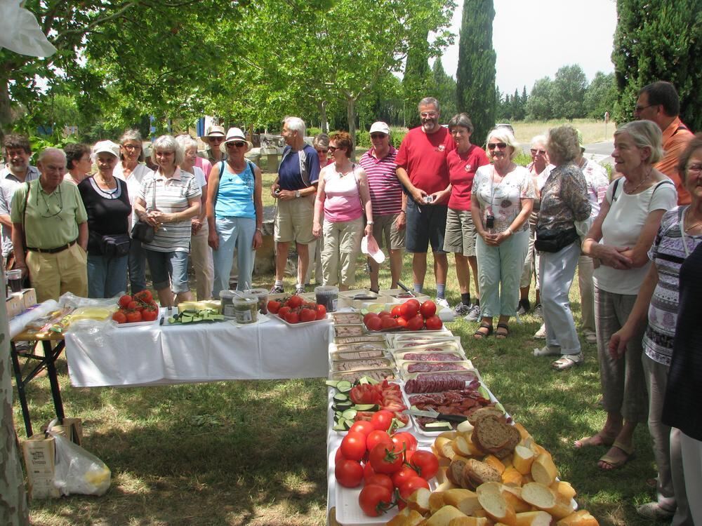 Ein zünftiges provenzalisches Picknick haben die Heideker-Fahrer unter Mithilfe einiger Gäste organisiert und zubereitet: Tomaten, Zucchini, Oliven, Schinken, Speck, Käse, Baguette und Rotwein.