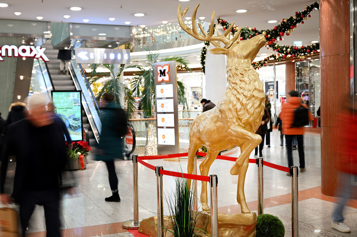Der goldglänzende Hirsch begrüßt zum Weihnachts-Shopping Foto: PR