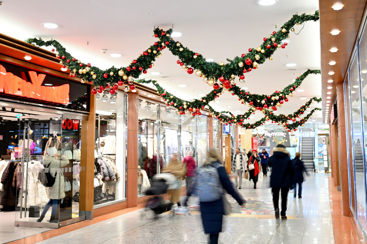 Funkelnde Sterne und Tannengrün über vier Etagen schaffen in der Müller Galerie eine glanzvolle Atmosphäre.