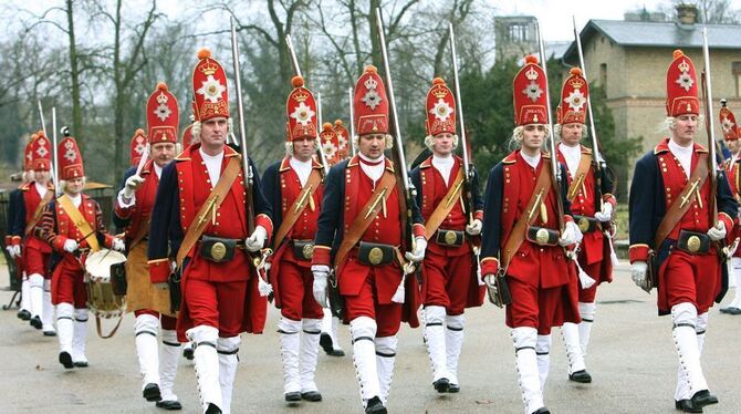 Mit der Kleidung und ihrer Figur fallen sie auf: große Männer in historischen Uniformen. Bei zackigen Befehlen marschiert die Truppe in Reih und Glied. Ein wesentlich kleinerer Trommler gibt den Rhythmus vor. Einstudierte Bewegungen, das Gewehr abgesetzt und geschultert - die Männer folgen genau den Anweisungen des »Spießes«. Wer aus der Reihe tanzt, riskiert einen derben Anraunzer.