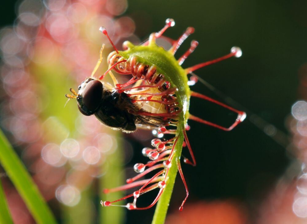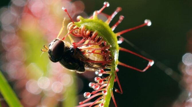 Sonnentau frisst Fliege: Das Tier bleibt an den Blättern hängen und wird selbst zur Hauptmahlzeit. Foto: dpa