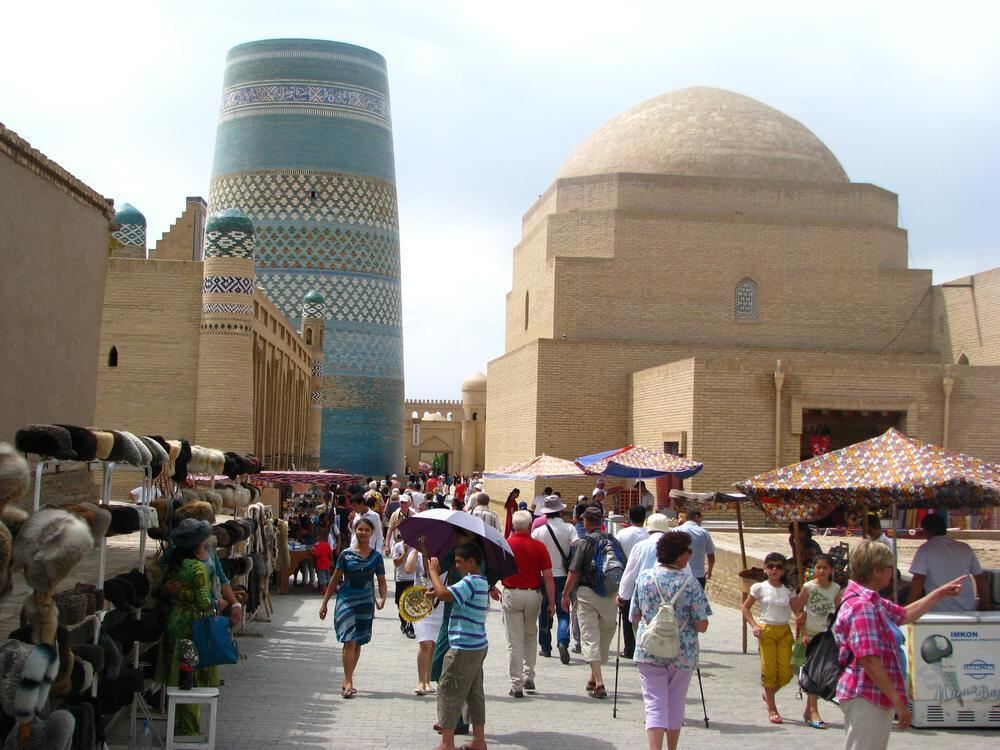 Mittelasien war über viele Jahrhunderte der Schmelztiegel verschiedener Kulturen. Auf den Routen der Seidenstraße die das Morgenland mit dem Abendland - Asien mit Europa - verband und heute noch verbindet spielten Usbekistans legendäre Städte Taschkent, Samarkand, Buchara und Chiwa eine entscheidende Rolle: Schnittpunkt im interkontinentalen Fernhandel zwischen Orient und Okzident. Vom chinesischen Xi’an über Kirgistan, Usbekistan, Turkmenistan, den Iran, Syrien und die Türkei reichte die Seidenstraße als einzigartiges Geflecht von Handelspfaden über 10000 Kilometer bis nach Rom. In anstrengenden bis zu 40 Kilometer langen Tagesmärschen waren die mit bis zu 1000 Kamelen zählenden Karawanen unterwegs und durchquerten Wüsten und Hochgebirge und mussten Temperaturen von -30 bis +50 Grad ertragen.