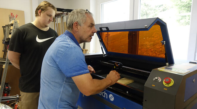 Wolfgang Reiser (rechts), Lehrer an der Karl-Georg-Haldenwang-Sonderberufsfachschule Mariaberg, zeigt, wie die neue Laser-Graviermaschine funktioniert. FOTO: VEIT/MARIABERG