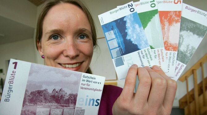 viele bunte Scheine: Karoline Opitz vom Kasseler Verein Bürgergeld zeigt die Kasseler Regionalwährung »BürgerBlüte«.