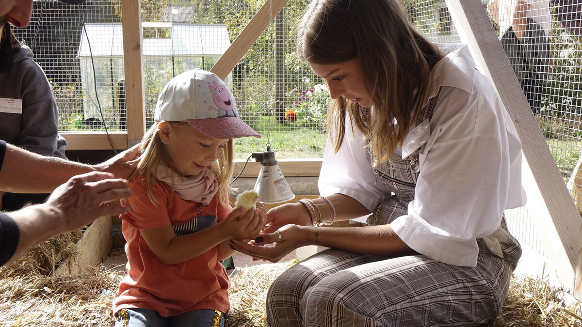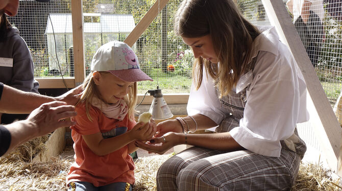 »Die Kinder soll man ausprobieren lassen«, findet Besucherin Birgit Mössner. Sie und ihre Familie nehmen gern über eine Stunde Fahrt auf sich, um zum Hoffest zu kommen; ihr Enkel baut beim Hoffest bereits den zweiten Vogelnistkasten für die heimische Streuobstwiese. Highlight für alle Kinder und Erwachsenen, war die Kükenbrüterei: Dort konnten frisch geschlüpfte Hühnerküken vorsichtig gestreichelt und ihre gerade schlüpfenden Geschwister im Brutkasten beobachtet werden. Von Apfelsaftpressen über Strohtierbasteln bis zum Kräutersalzherstellen konnten die Gäste einiges über die ökologische Landwirtschaft lernen und in Kontakt mit den betreuten Beschäftigten der Mariaberger Werkstätten kommen.
