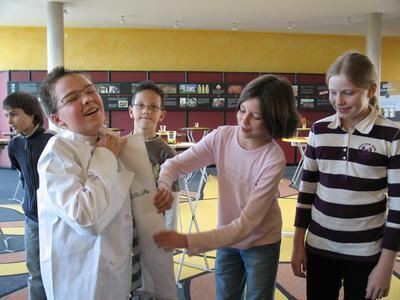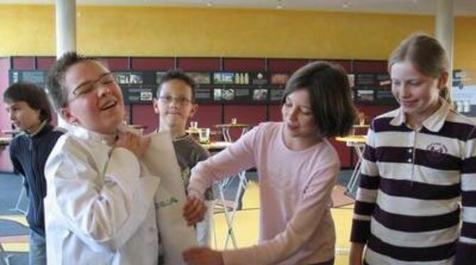 Auch das mit den Knöpfen geht bald wie geschmiert. Einkleiden der Miniköche zum Fototermin für das Online-Spezial des Reutlinger General-Anzeigers.