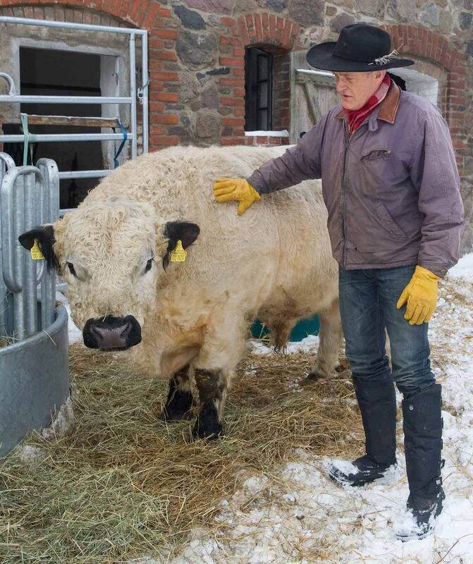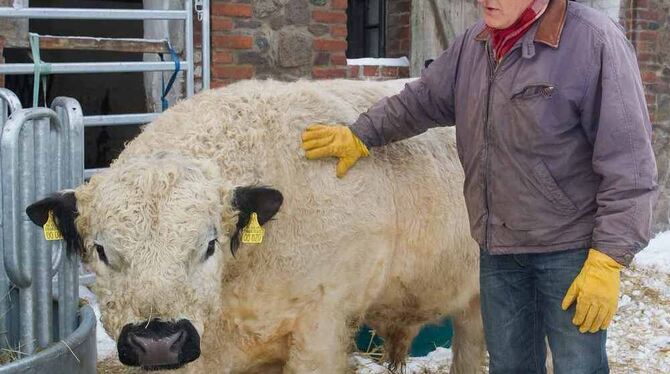 Dieter Moor mit einem seiner Galloway-Rinder.