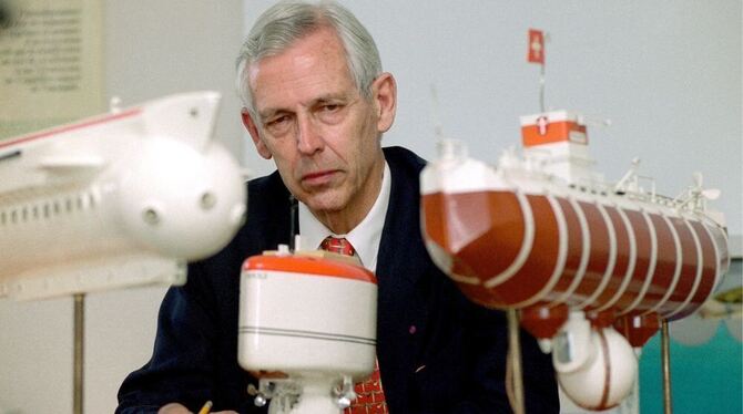 Der Schweizer Tiefseeforscher Jacques Piccard und Modelle seiner U-Boote. Aufgenommen am 30. Juni 1995 in seinem Labor im schweizerischen Cully.