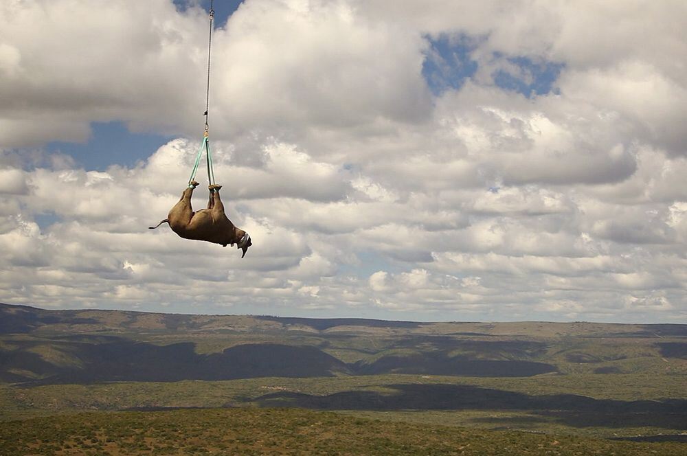 Ein gefährdetes Nashorn wird per Hubschrauber in ein sichereres Gebiet transportiert. Foto: dpa