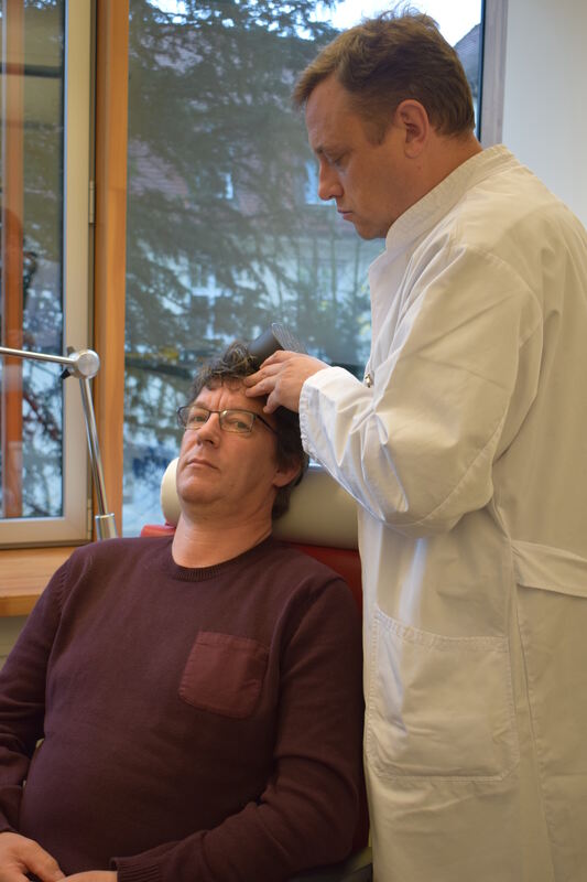 Christian Plewnia demonstriert an Thomas Möll den Einsatz der Magnetspule. FOTO: STÖHR