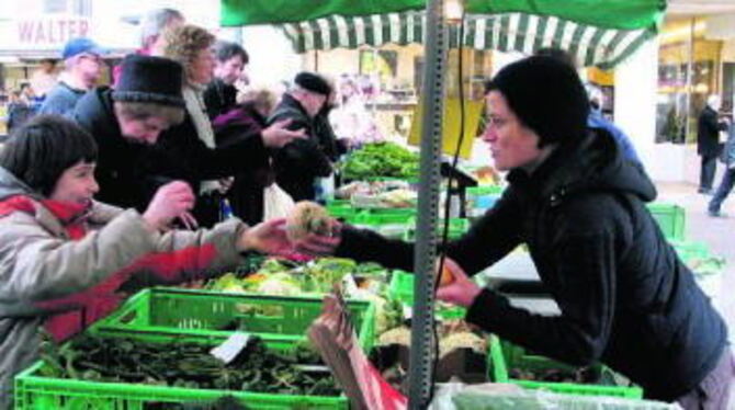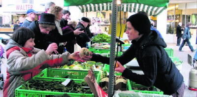 Reichlich Auswahl an saisonalem Gemüse finden Jonas (mit blauem Anorak) und Yanik Bretzler auf dem Wochenmarkt.