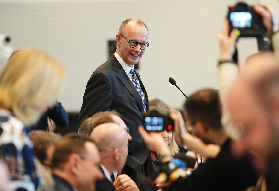 Der designierte Bundeskanzler Friedrich Merz (CDU) im Mittelpunkt. In Sachen Koalition hat er schon Kontakt zur SPD aufgenommen. FOTO: NIETFELD/DPA