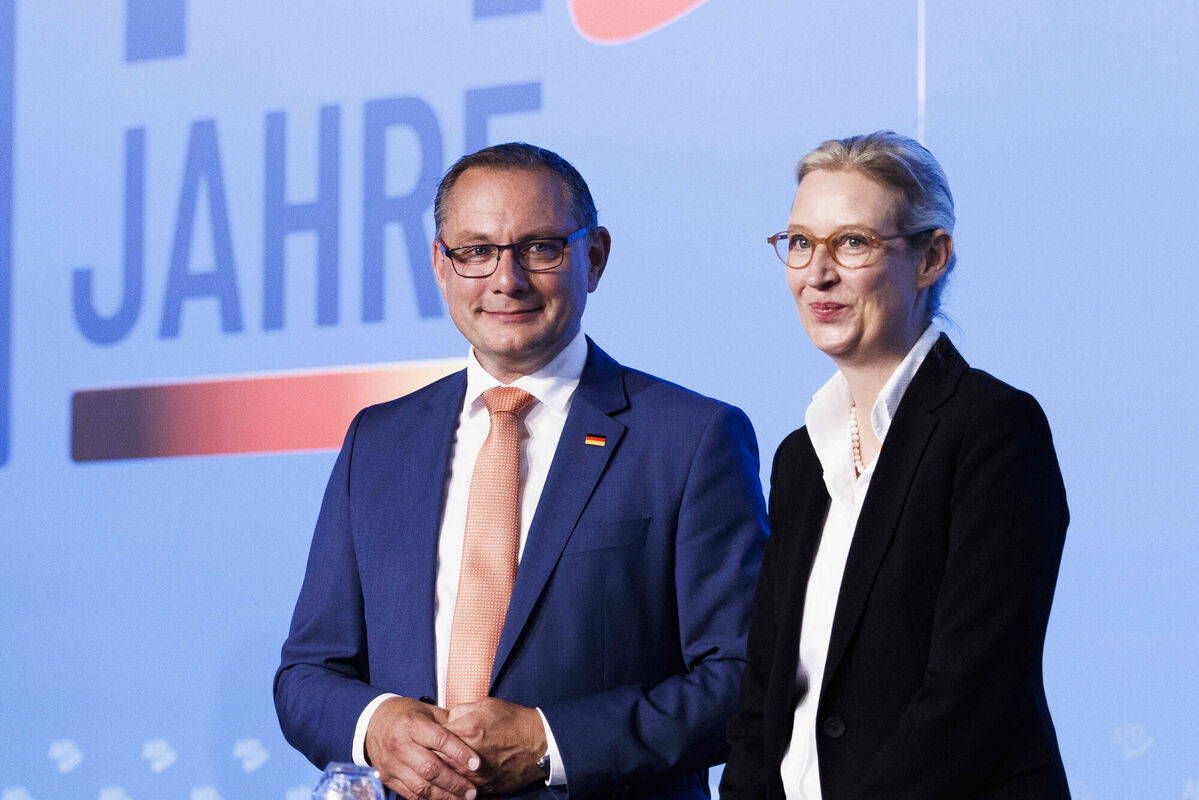 Angesichts guter Umfragewerte starten die AfD-Parteivorsitzenden Tino Chrupalla und Alice Weidel gut gelaunt in den Parteitag. FOTO: KOALL/DPA