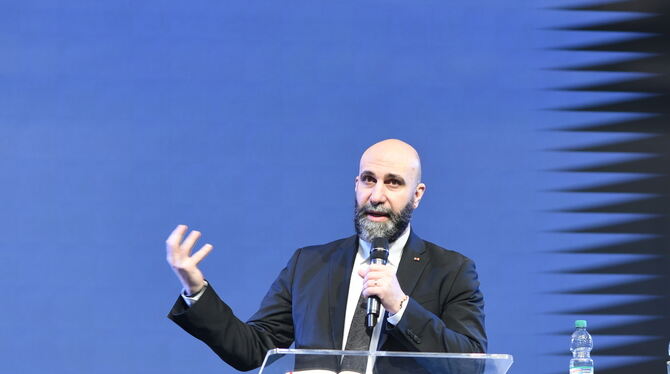 Ahmad Mansour spricht über die Auswirkungen des Hamas-Überfalls am 7. Oktober 2023 in einer Reutlinger Kirche.