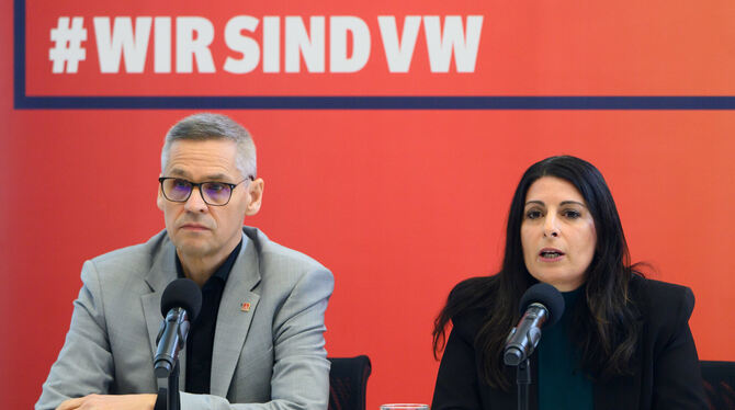 Thorsten Gröger, IG Metall-Verhandlungsführer, und Daniela Cavallo, Gesamtbetriebsratsvorsitzende Volkswagen, sprechen bei einer Pressekonferenz. Die IG Metall und der Volkswagen-Gesamtbetriebsrat präsentieren Eckpunkte eines Gesamtkonzepts für Volkswagen.