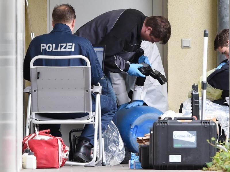 Sprengstoffexperten und Beamte der Spurensicherung arbeiten in Oberursel vor einer Wohnung. Foto: Boris Roessler