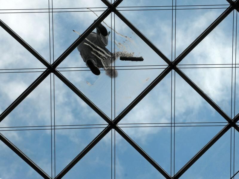 Ein Fensterputzer auf dem gläsernen Dach eines Geschäftshauses. Foto: Matthias Hiekel