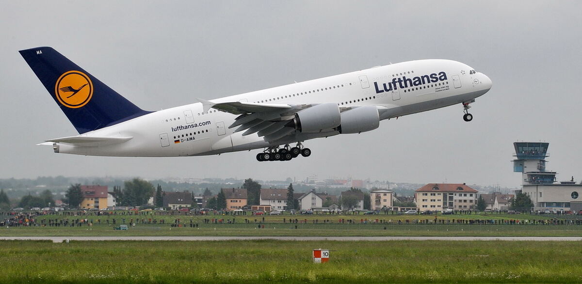 Der A 380, das neue Flaggschiff der Lufthansa, landet auf dem Stuttgarter Flughafen.