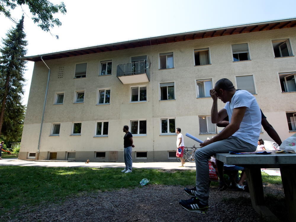 Ein Flüchtling sitzt vor einer Gemeinschaftsunterkunft für Asylbewerber.