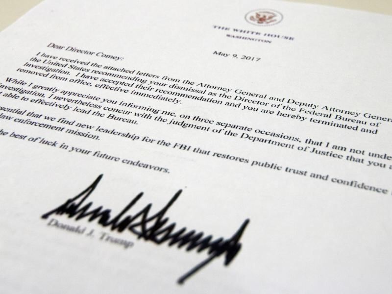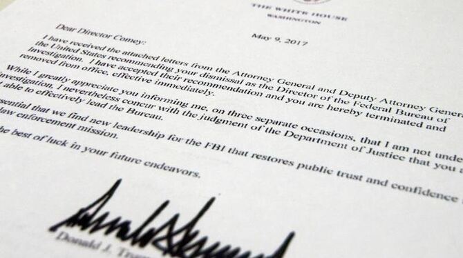 Das Entlassungsschreiben von US-Präsident Trump an den FBI-Direktor. Comey wurde von Trump fristlos entlassen. Foto: Jon Elswick