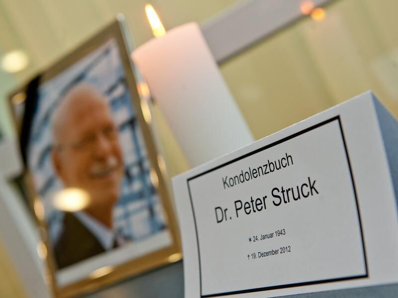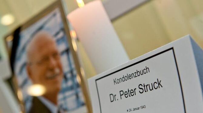 Ein Kondolenzbuch liegt im Rathaus von Uelzen für den verstorbenen SPD-Politiker und ehemaligen Verteidigungsminister Peter Struck aus. Foto: Philipp Schulze/Archiv