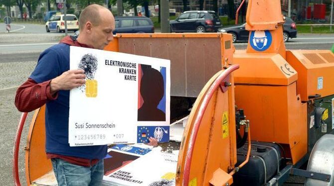 Viele Ärzte wollen sie nicht: Bei einer Aktion der Freien Ärzteschaft werden überdimensionale Gesundheitskarten geschreddert.Foto: Peter Steffen