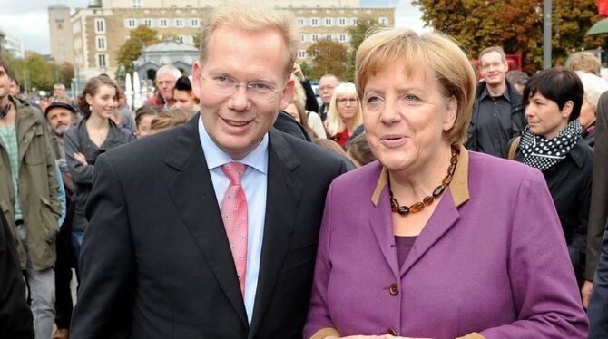 Angela Merkel und Sebastian Turner bei einer Wahlkampfveranstaltung auf dem Stuttgarter Marktplatz. FOTO: dpa