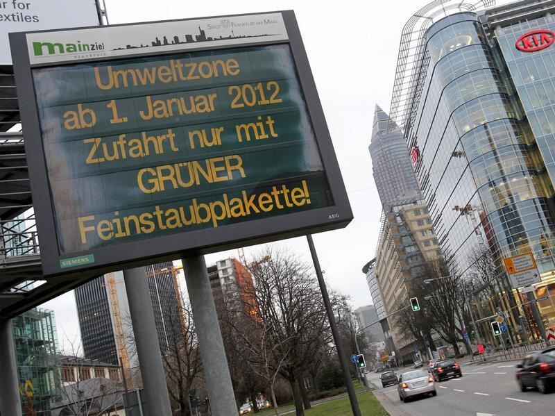 Ein Schild an der Frankfurter Messe weist darauf hin, dass zu Jahresbeginn die dritte Stufe der Umweltzone in Kraft tritt. Foto: Roland Holschneider