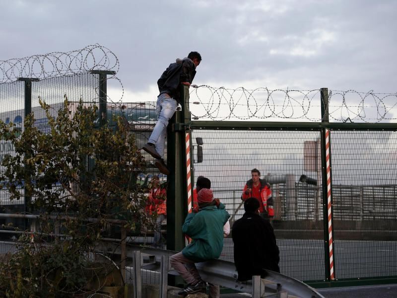 Flüchtlinge klettern über einen Zaun, um einen Zug von Calais nach Dover zu erreichen. Foto: Yoan Valat