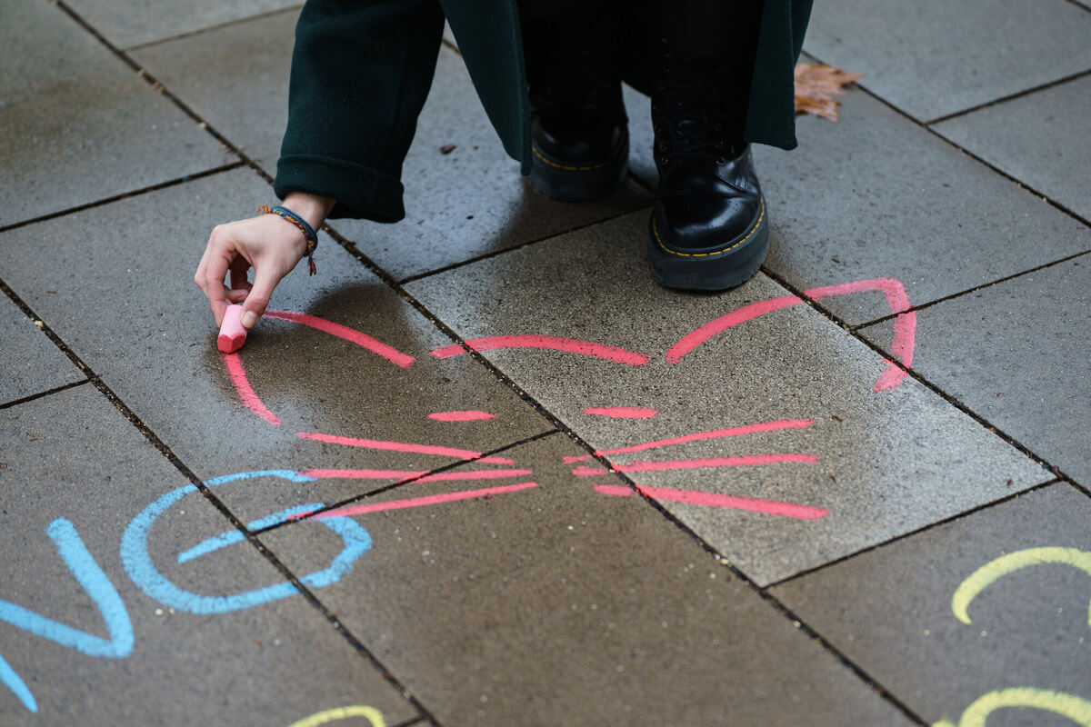 Eine Aktivistin malt mit Kreide ein Katzensymbol neben einen anzüglichen Kommentar aufs Straßenpflaster.